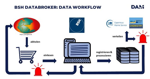 Während dieser automatisierten Routinen durchlaufen die Daten eine zusätzliche interne Qualitätskontrolle des BSH DataBrokers. Bei Unstimmigkeiten werden fehlerhafte Daten und Metadaten nachverfolgt und Rückmeldung an PANGAEA, bzw. direkt an die Data Stewards gegeben. Im Anschluss durchlaufen die produzierten Datensätze die jeweiligen Qualitätskontrollen der internationalen Datenportale. Bei auftretenden Fehlern wird eine Rückmeldung an den BSH Data Broker gesendet.