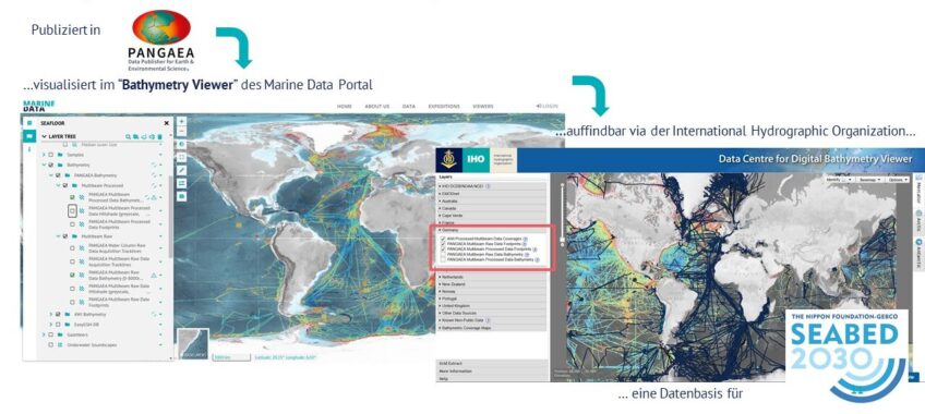 Bathymetrie-Daten werden unabhängig vom Data Broker direkt über den PANGAEA Bathymetry Web Map & Feature Service der internationalen Community zur Verfügung gestellt. Der Webdienst ist z.B. im Viewer des Data Centre for Digital Bathymetry (DCDB) der International Hydrographic Organization (IHO), einem global anerkannten Datenportal für Bathymetrie-Daten, integriert (https://www.ncei.noaa.gov/maps/iho_dcdb/). Alle in PANGAEA publizierten Bathymetrie-Daten (Rohdaten sowie prozessierte Daten) werden somit systematisch in den Webdienst aufgenommen und stehen so u.a. für das „Nippon Foundation-GEBCO Seabed 2030” Projekt für die Nachnutzung bzw. Integration der Daten zur Verfügung.