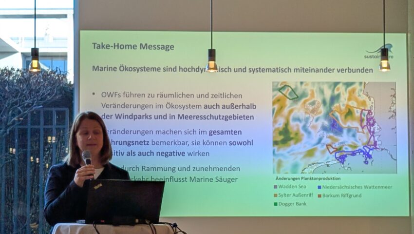 In ihrem wissenschaftlichen Impulsvortrag stellten Corinna Schrum, Ute Daewel und Andreas Kannen vom Helmholtz-Zentrum Hereon aktuelle Forschungsergebnisse aus der DAM-Forschungsmission sustainMare vor. Adressiert wurden mögliche Auswirkungen des geplanten Ausbaus der Offshore-Windenergie in der Nordsee sowie Lösungsansätze, um den Ausbau nachhaltig zu gestalten.